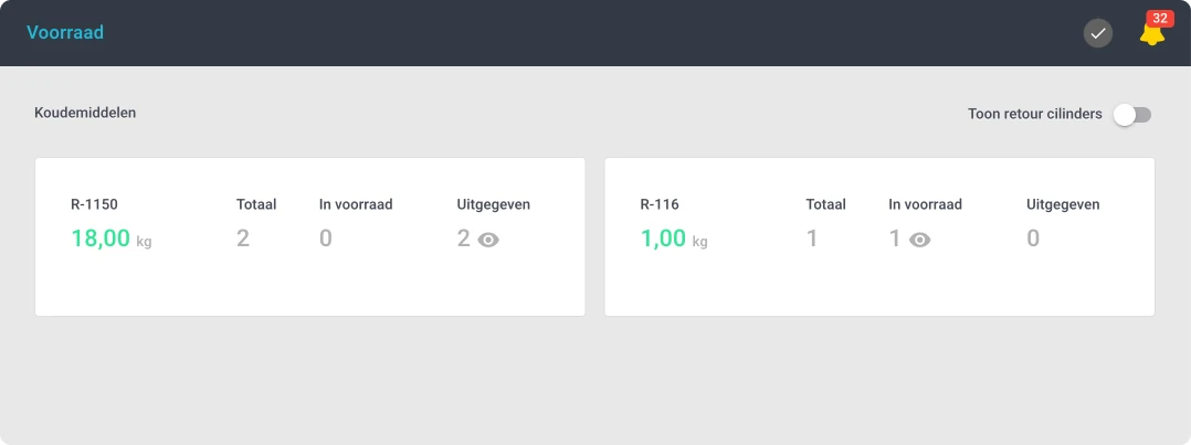 - Geoptimaliseerd Voorraadbeheer: Realtime inzicht in je koudemiddelbalans helpt bij het plannen en uitvoeren van onderhoudstaken.